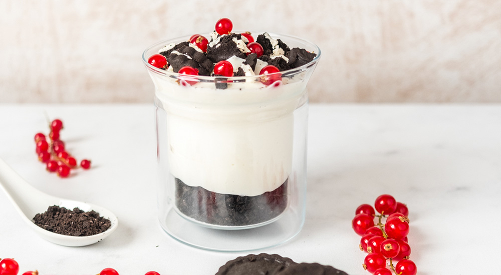 Abre tres galletas, saca la crema y mézclala con 200gr de queso fresco batido. Por otro lado, machaca las galletas. Finalmente, introduce las galletas machacadas en el fondo de un vaso, añade la mezcla de crema y queso y termina decorándolo con grosellas y trocillos de galleta. ¡Un postre de restaurante!